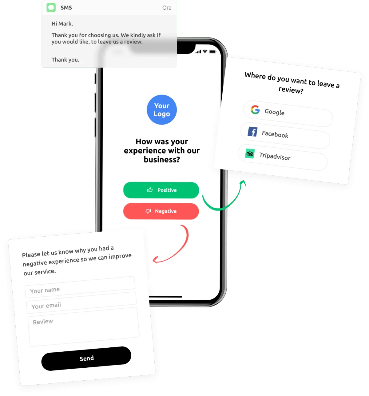 Direct unsatisfied customers to a private feedback form while encouraging happy customers to leave public reviews on e.g. on Google or Facebook. Our landing page review filter ensures you manage negative feedback discreetly and showcase positive reviews to build trust and credibility.